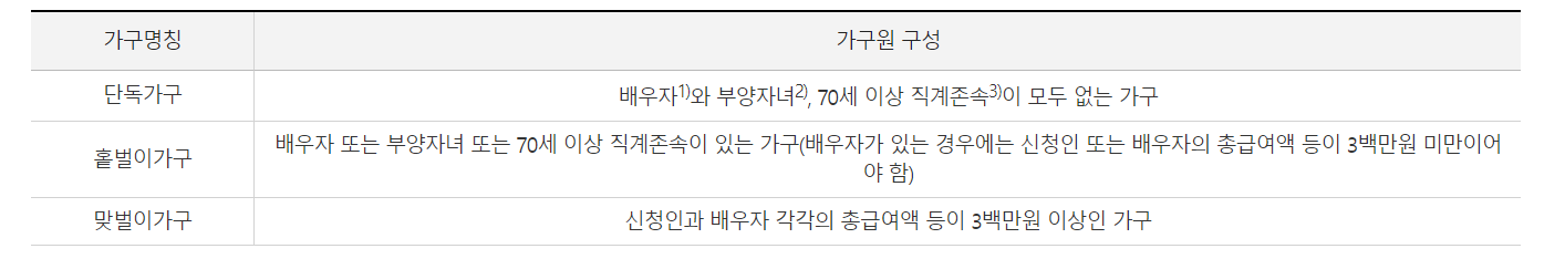 - 맞벌이 가구 : 8백만 원 ~ 1,700만 원 미만 -> 300만 원 지급
