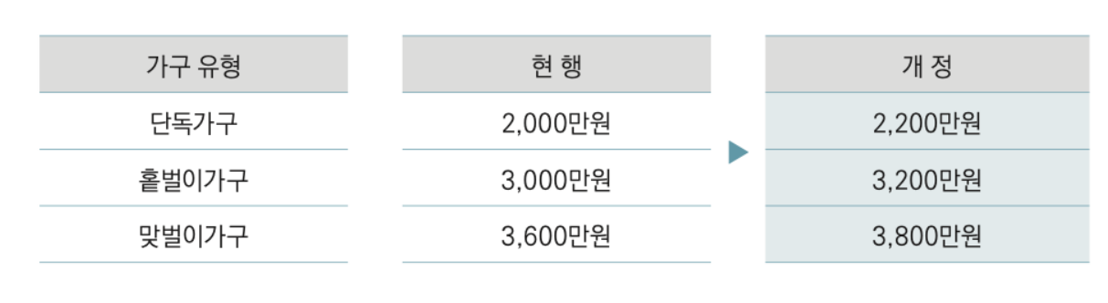 단독 가구는 2,200만 원, 홑벌이 가구 3,200만 원 맞벌이 가구 3,800만 원으로 인상되어 1년간 총소득이 위의 금액보다 적다면 모두 신청 가능합니다.